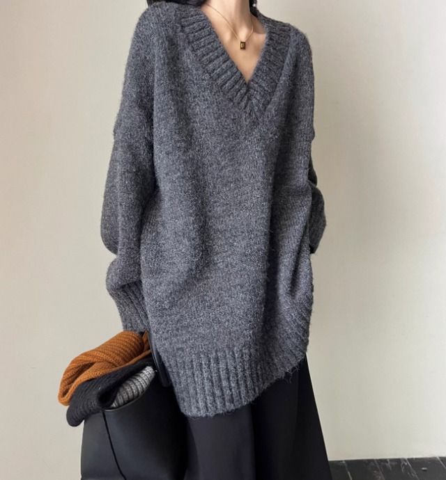 深めのVネックが、デコルテを美しく引き立てるニット。ゆったりとしたオーバーサイズシルエットで、リラックス感漂う着こなしが叶います。長めの袖は自然とくしゅっとたまるので着るだけでこなれた印象に。カジュアルなデニムから、きれいめなスカートまで、幅広いスタイリングに合わせやすい一枚です。 【サイズ詳細】 【F】 胸囲:136cm 着丈:70cm ※2〜3cmの誤差がある場合がございます。 【カラー】 ブラック グレー 【商品番号】 098 ーーご案内ーー 海外取り寄せ商品について この商品は【海外取り寄せ商品】でございます。 ご注文確定後、海外メーカーよりお取り寄せいたします。 お届けまでの目安は約14日~24日程度となります。 数あるショップの中から当店をご覧いただき、誠にありがとうございます。 ご購入の際は、下記の注意事項をよくお読みのうえお手続きくださいませ。 ※注意事項 誠実なお取引をお約束いたします。 お取引が最後まで円滑に進むよう、責任を持って対応いたします。 ご不明な点やご心配なことがございましたら、トラブル防止のためにもご遠慮なくお問い合わせください。 【 返品・交換について】 商品到着後の「サイズ変更」「カラー・イメージの違い」「実寸の差異」などによる返品・交換・クレームはお受けできません。 (※初期不良・破損の場合を除きます) 上記にご理解いただける方のみご購入をお願いいたします。 【海外製品についてのご理解】 海外製品は、日本製品に比べて縫製や仕上がりに多少の個体差が見られる場合がございます。 軽微な糸のほつれ、縫製の甘さ、わずかな色味の違いなどがある場合もございますが、製品の特性としてご理解ください。 【納期について】 お届けまでの目安は約14日~24日程度です。 ご注文後に、海外メーカー側で在庫切れが判明した場合は、誠に申し訳ございませんがキャンセルとさせていただく場合がございます。あらかじめご了承くださいませ。 【個人情報の取り扱いについて】 お客様の個人情報は、発送業務以外の目的で使用することは一切ございません。 安心してお買い物をお楽しみください。 【キャンセルについて】 ご注文確定後の「お客様都合によるキャンセル」はお受けできません。 何卒ご理解賜りますようお願い申し上げます。 皆さまに安心してお買い物を楽しんでいただけるよう、スタッフ一同心を込めて対応いたします。 引き続き、当店をどうぞよろしくお願いいたします。