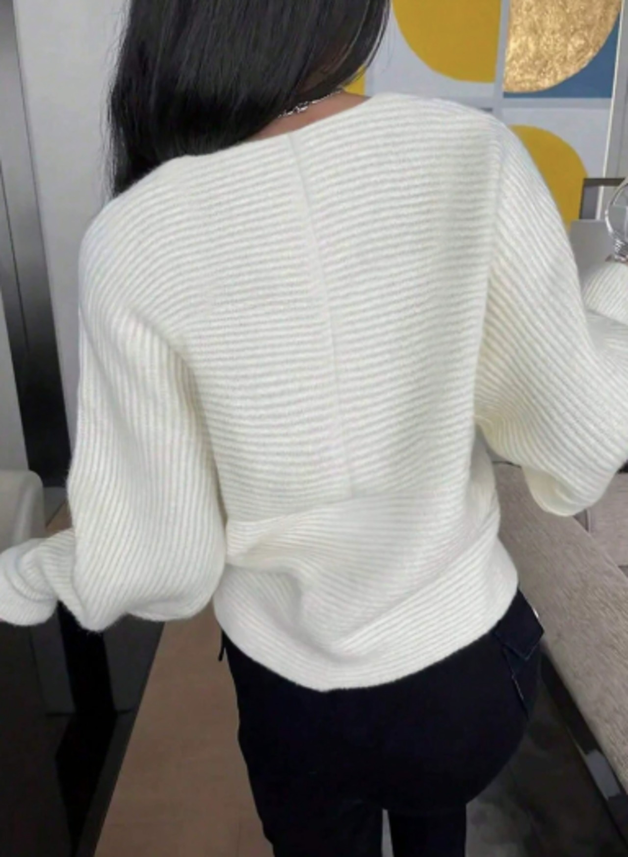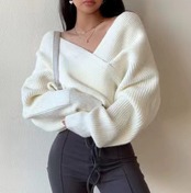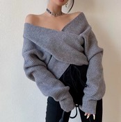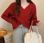クロスVネック無地ニットトップス レディース セクシーで上品な長袖プルオーバーセーター【ブルベ向け】