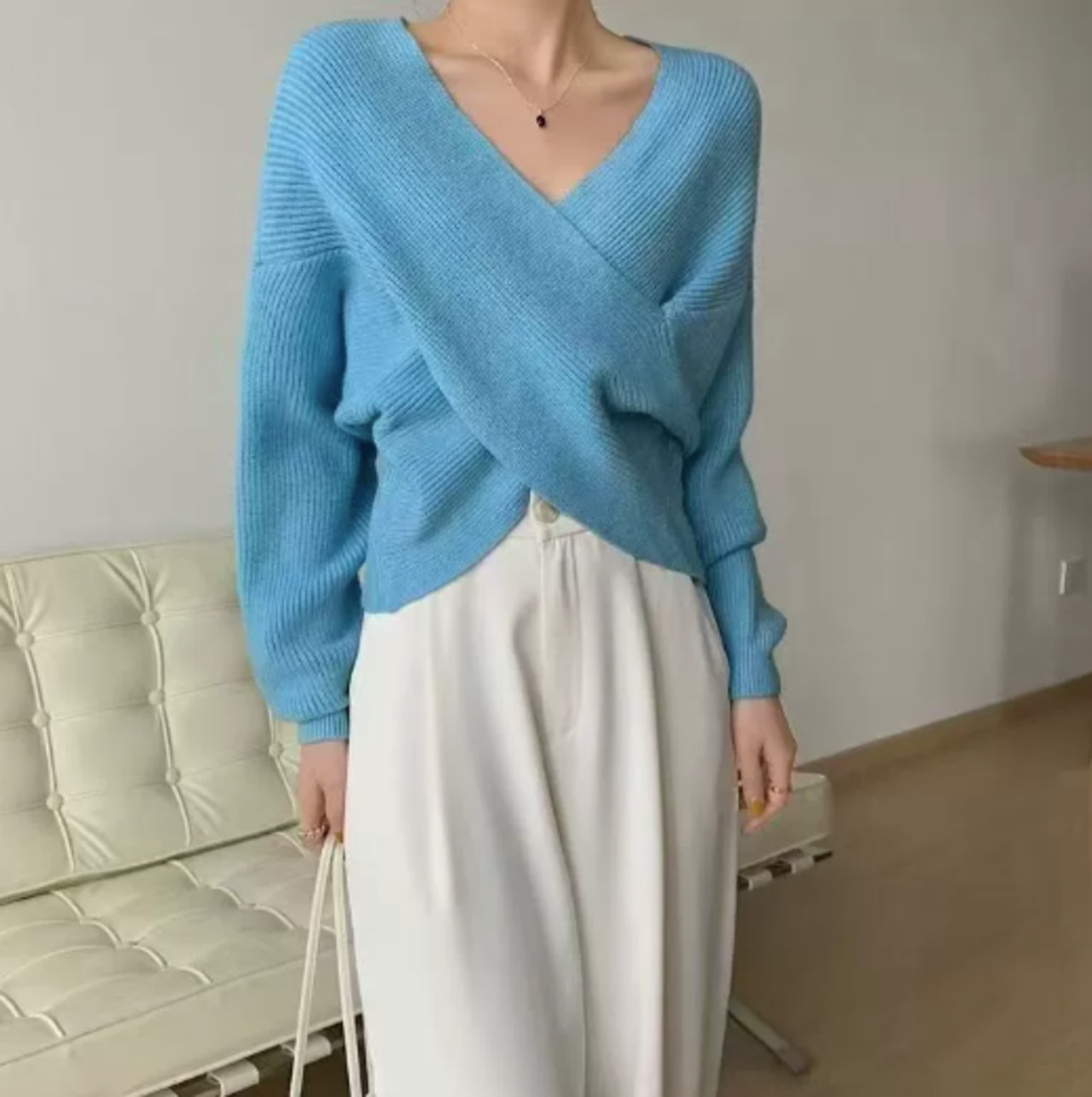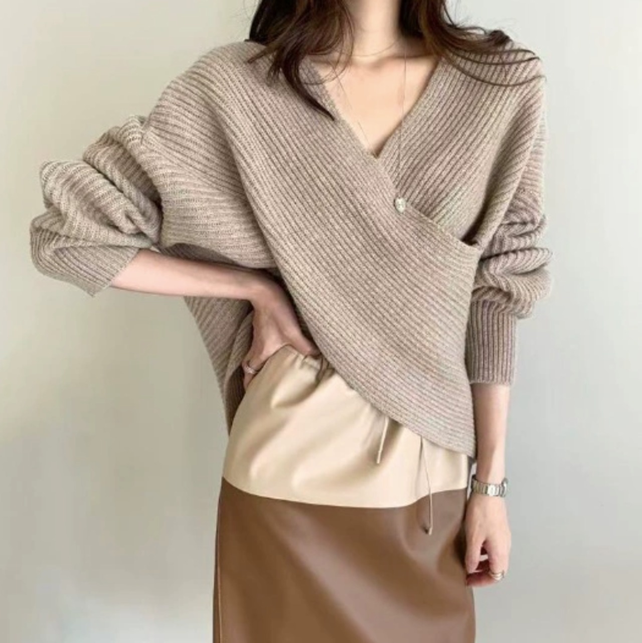 クロスVネック無地ニットトップス レディース セクシーで上品な長袖プルオーバーセーター【イエベ向け】