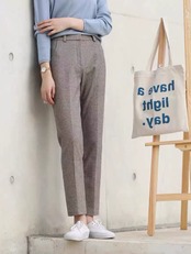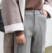 ヘリンボーン厚手ウールパンツ、ハイウエスト、スリミング、カジュアル、ストレートレッグ、クロップド、エレガント