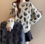 ヒョウ柄 ビーズラインストーンプルオーバーニットセーター