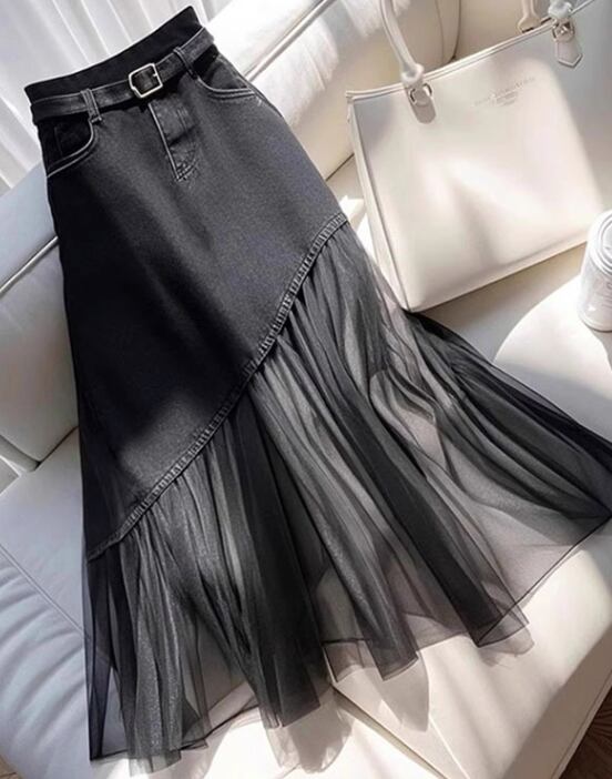 ブラックデニムスカート チュール Aライン ミディ丈スカート