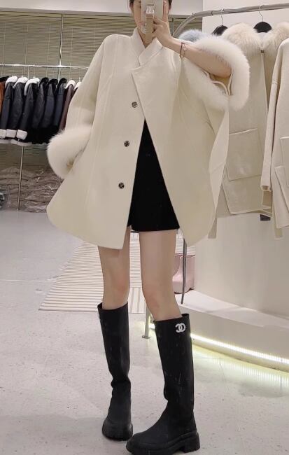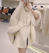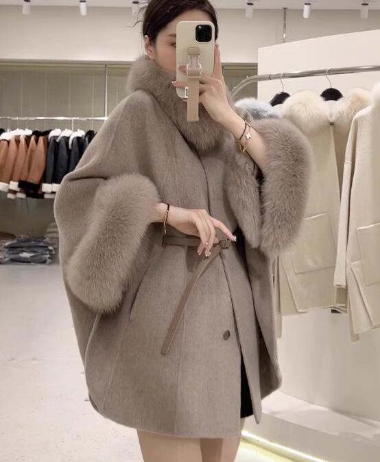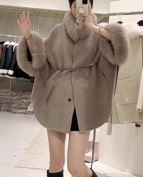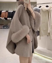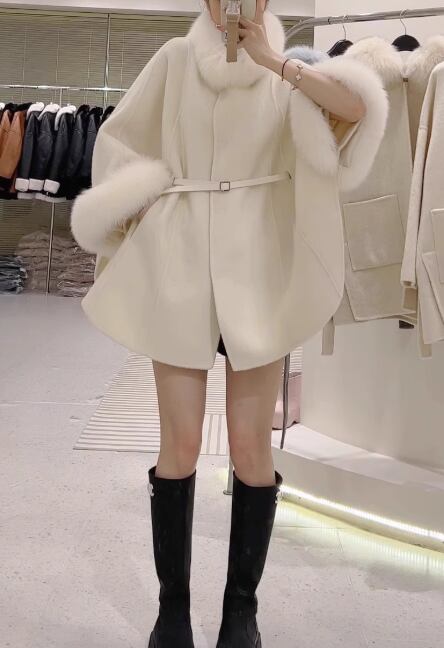 ベルト付き ミディアム丈 ファーカラー ケープ