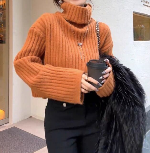 タートルネック クロップド丈 長袖 ニットプルオーバー