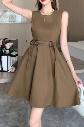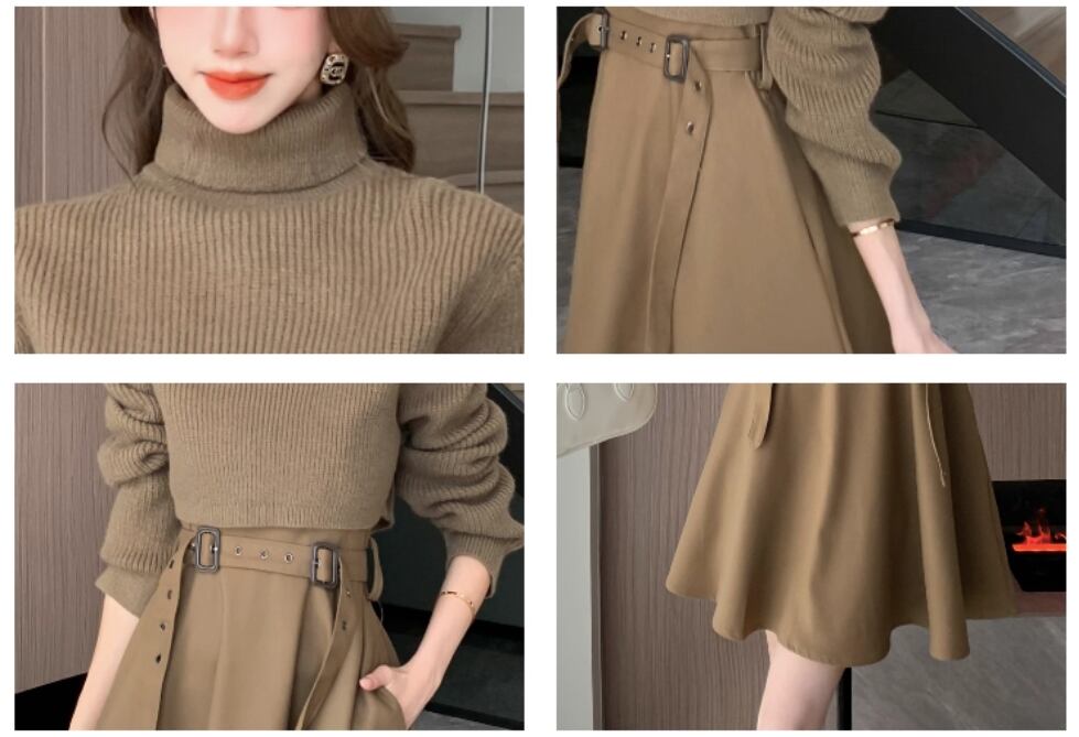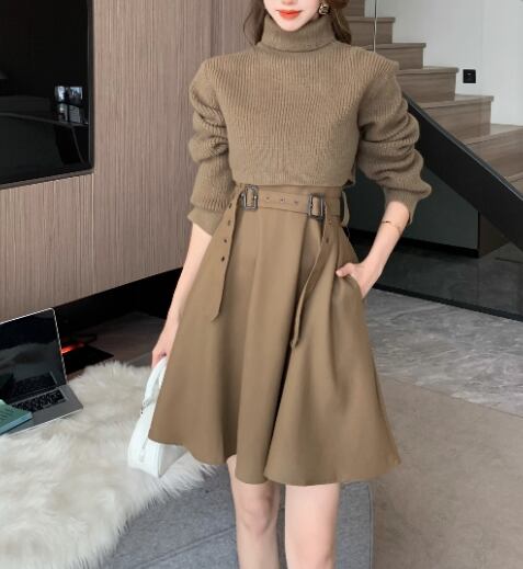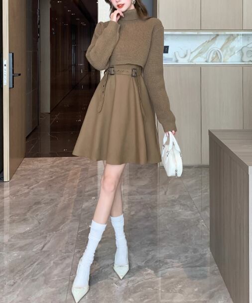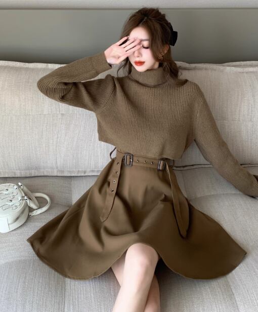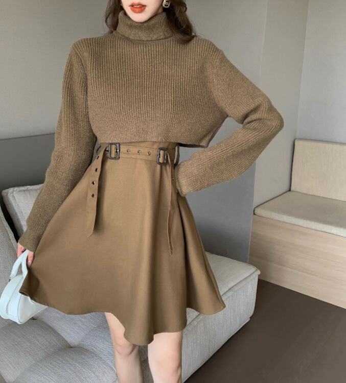 ハイネック クロップド ニット ベルト付き Aラインワンピース /茶色
