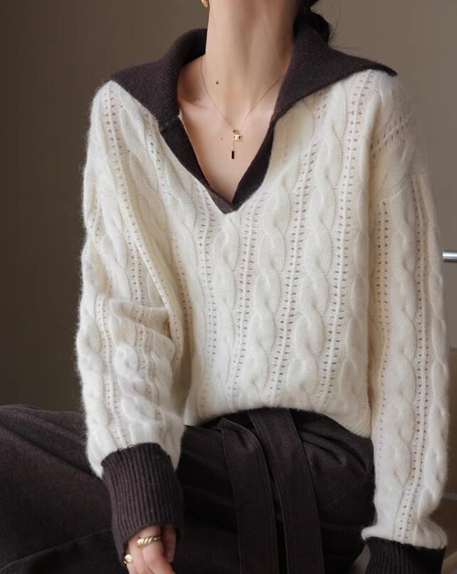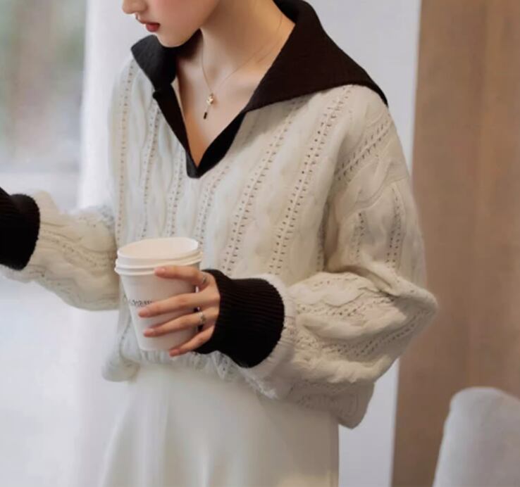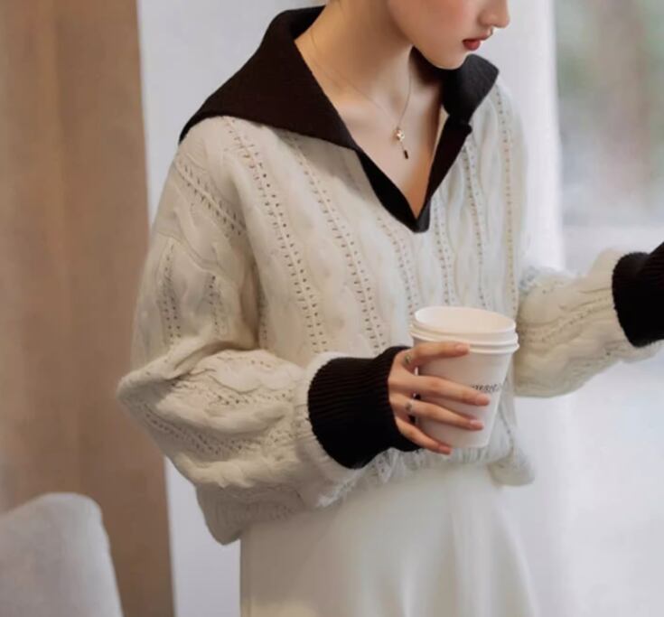 バイカラー 長袖 ショート丈 ニットプルオーバー / 035