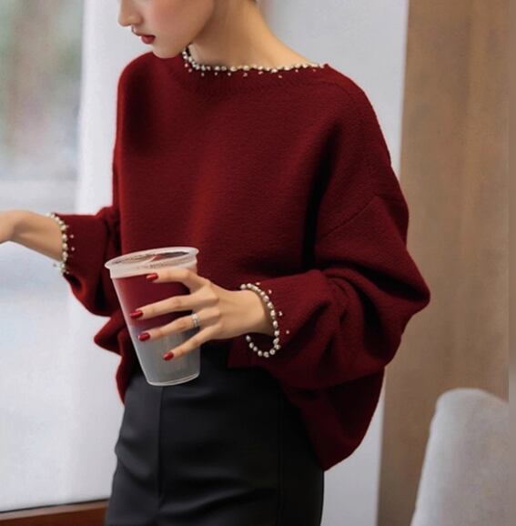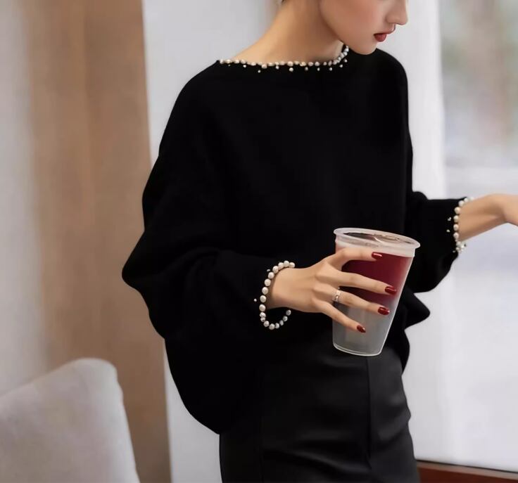 シンプルな装いに華やかさをプラスする、パールトリムが特徴の長袖ニット。首元と袖口のパールが、さりげなく上品さを演出します。オフィスでのきちんとスタイルから、休日のカジュアルスタイルまで、幅広く活躍するアイテムです。