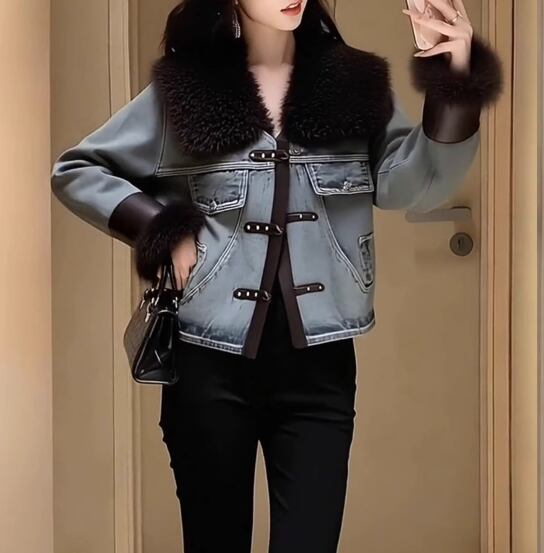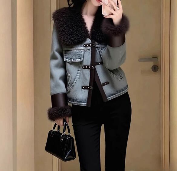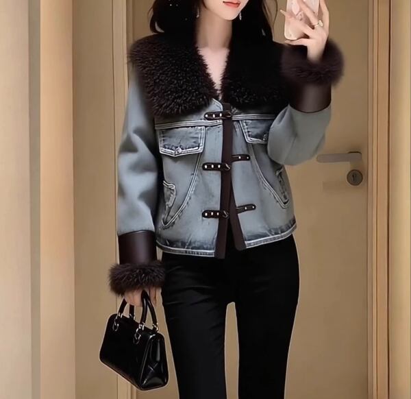 ファー襟 スナップボタン留め 腰丈 デニムジャケット / 045
