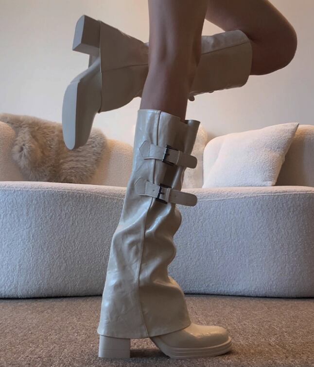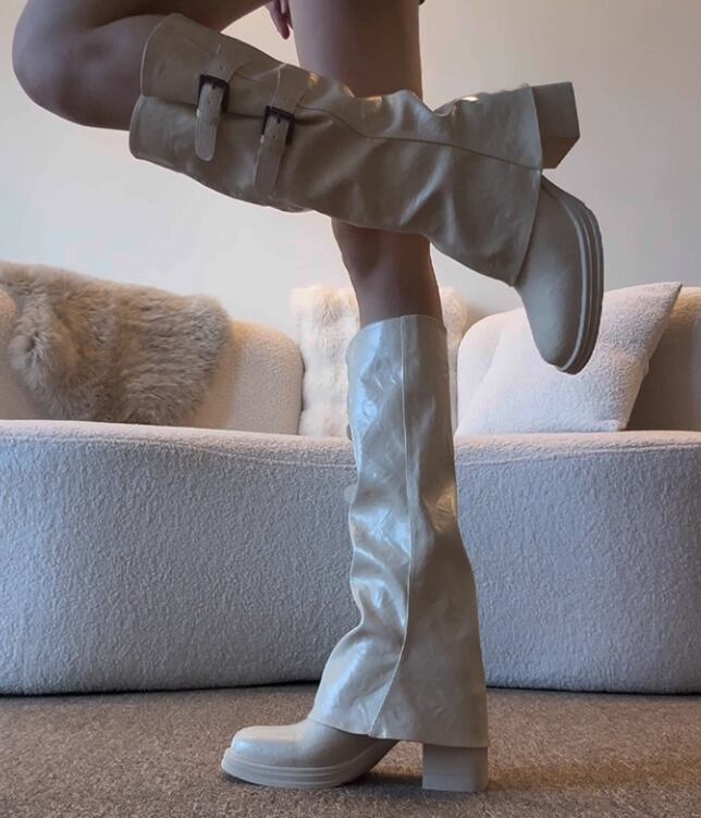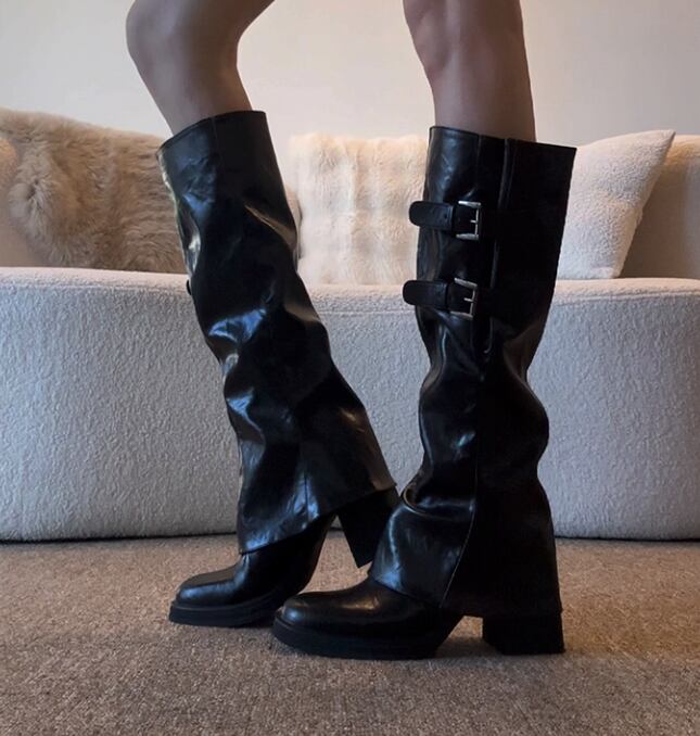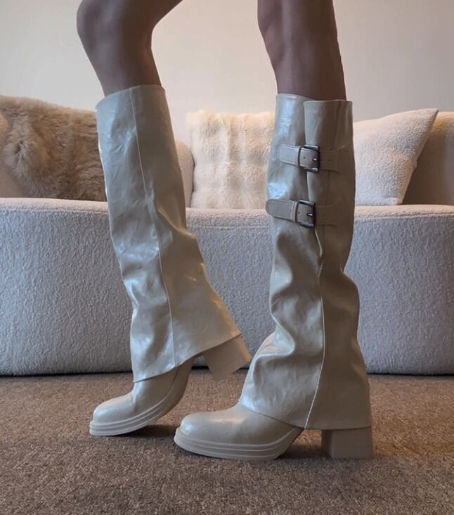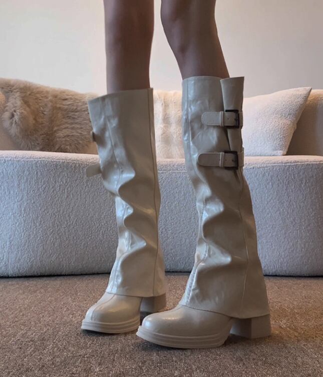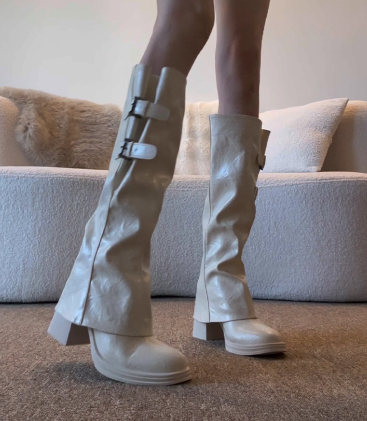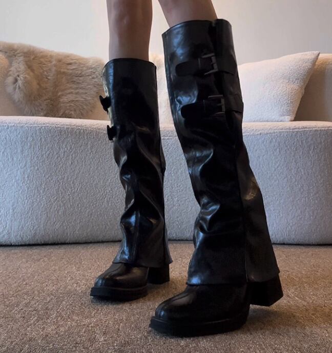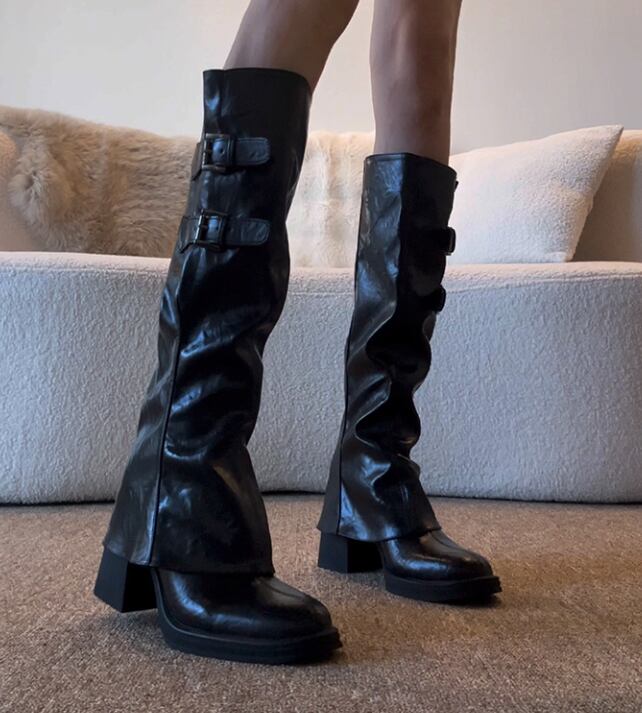 ベルト スクエアトゥ 膝下丈 フェイクレザー ブーツ / 048