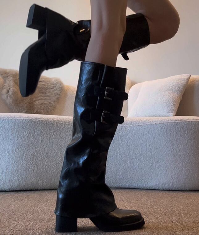 スクエアトゥと膝下丈が、スタイリッシュな印象を与えるブーツ。