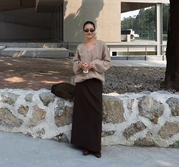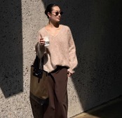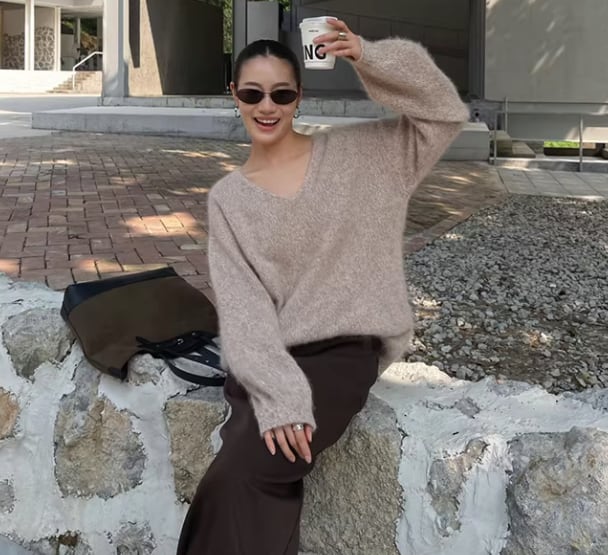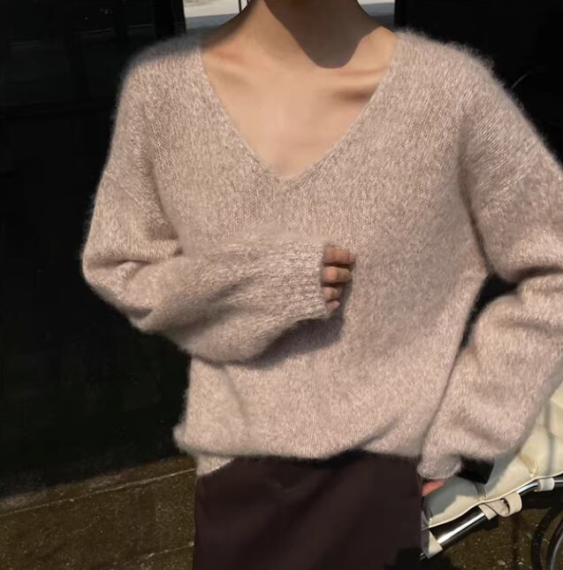 深めに開いたVネックが、デコルテを美しく引き立てるニット。ヒップが隠れる丈感で、様々なボトムスとの相性も抜群です。シンプルなデザインは、普段使いはもちろん、オフィスシーンにも活躍します。