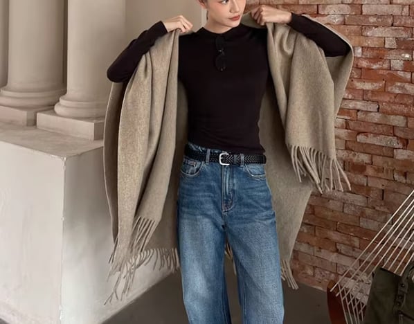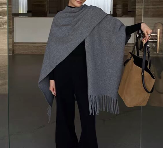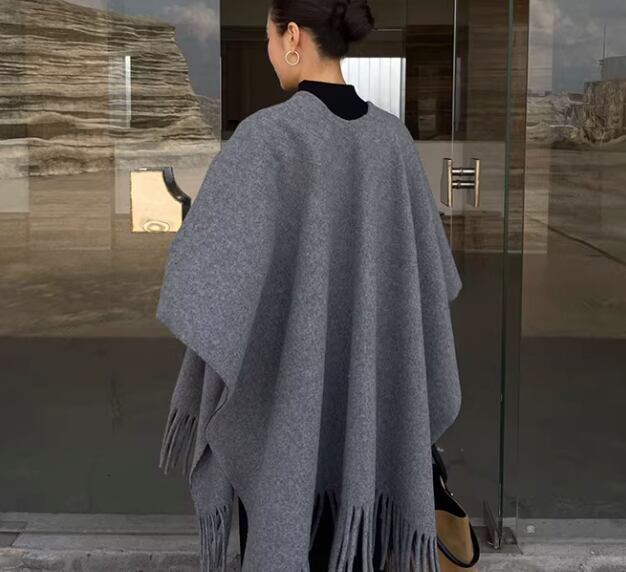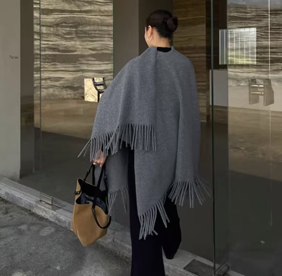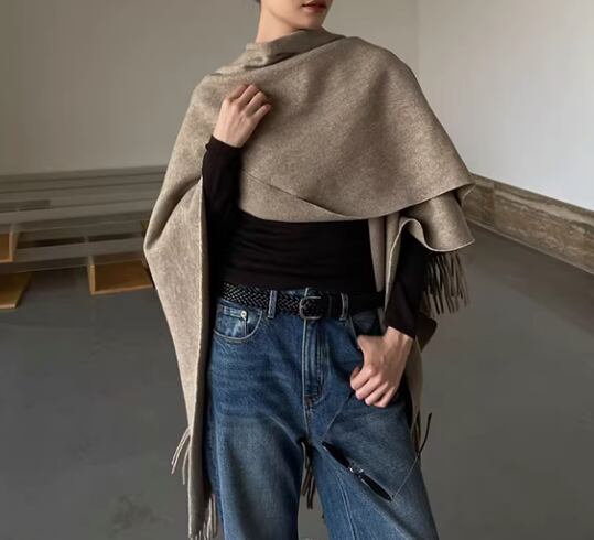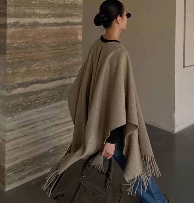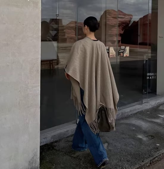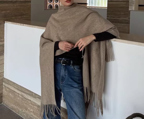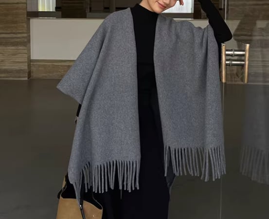 両端のフリンジが、着こなしにアクセントを加えてくれるショールポンチョ。
