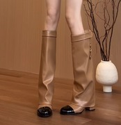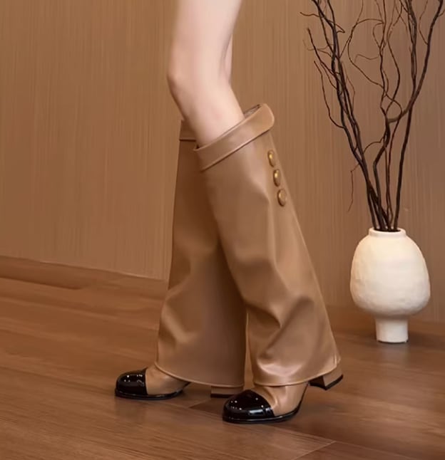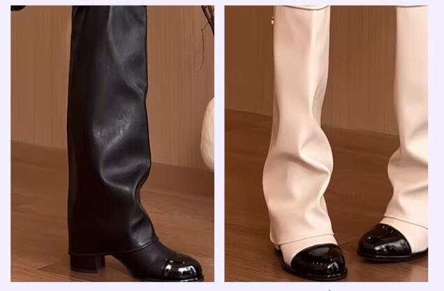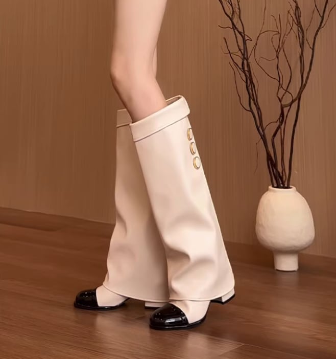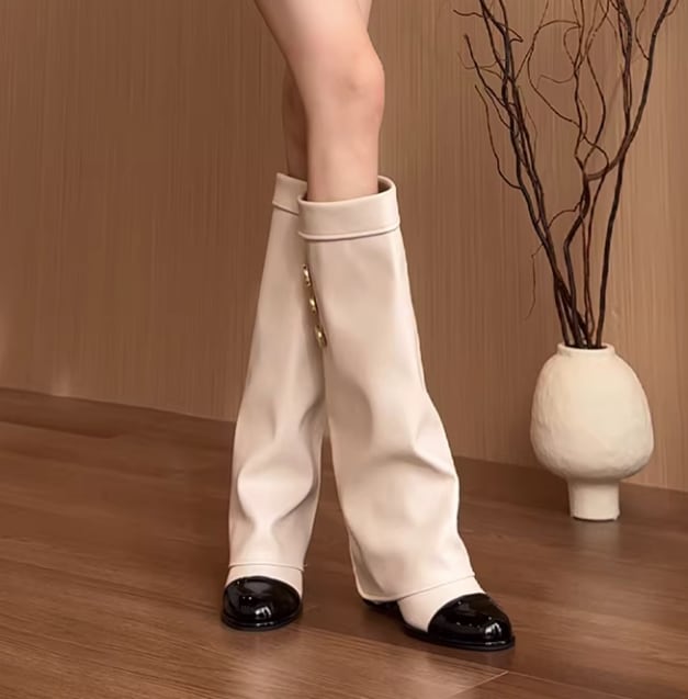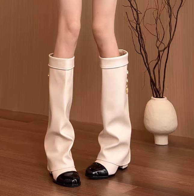 バイカラーデザインが目を引く膝丈ブーツ。