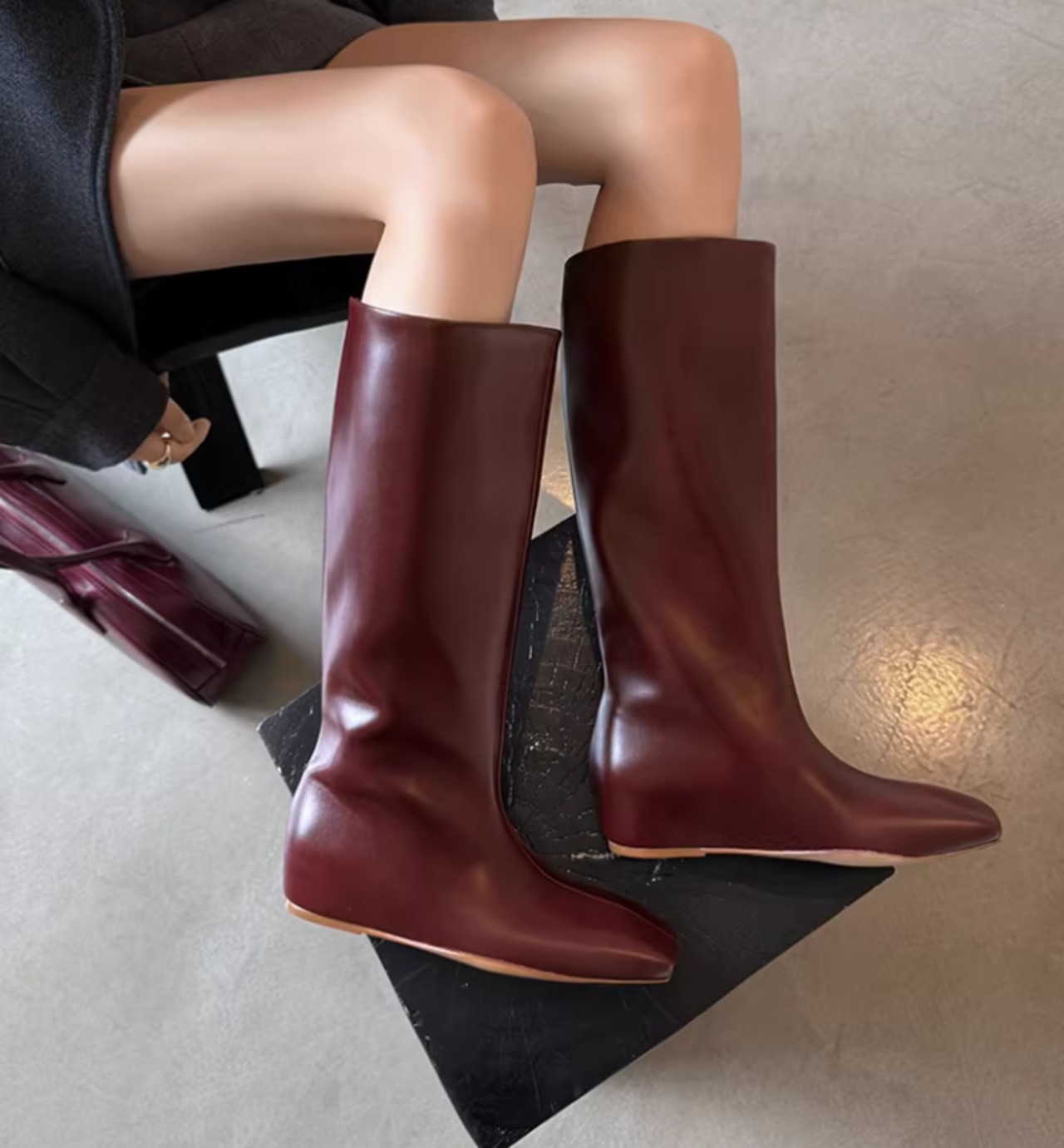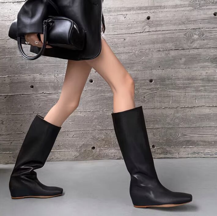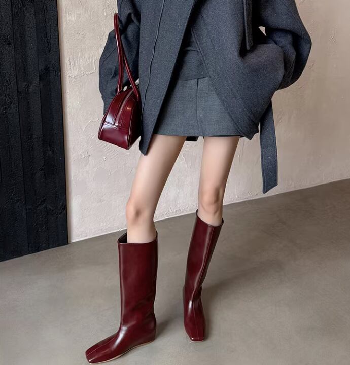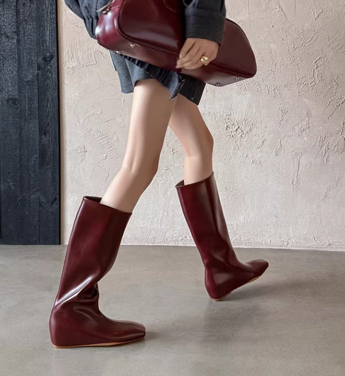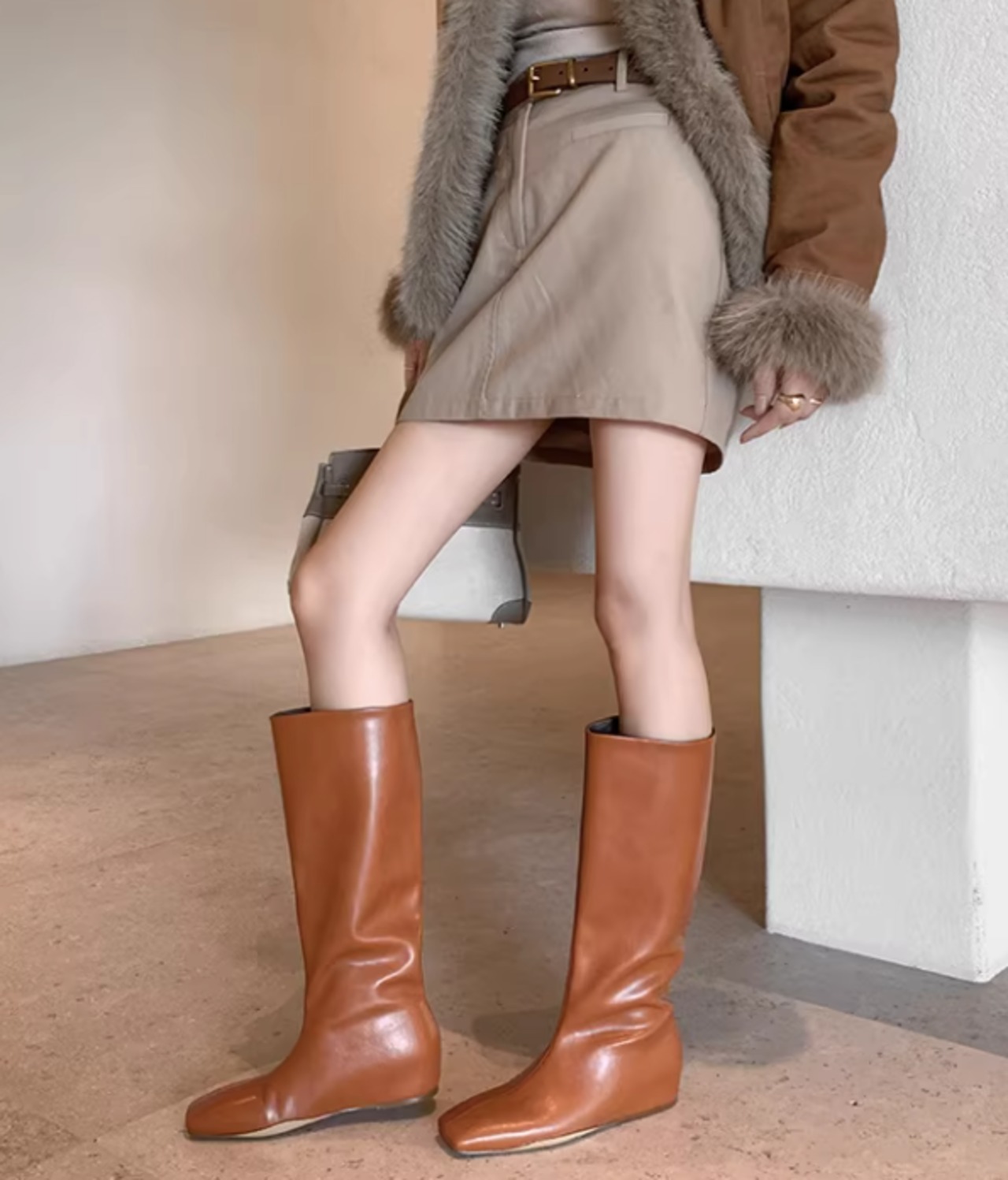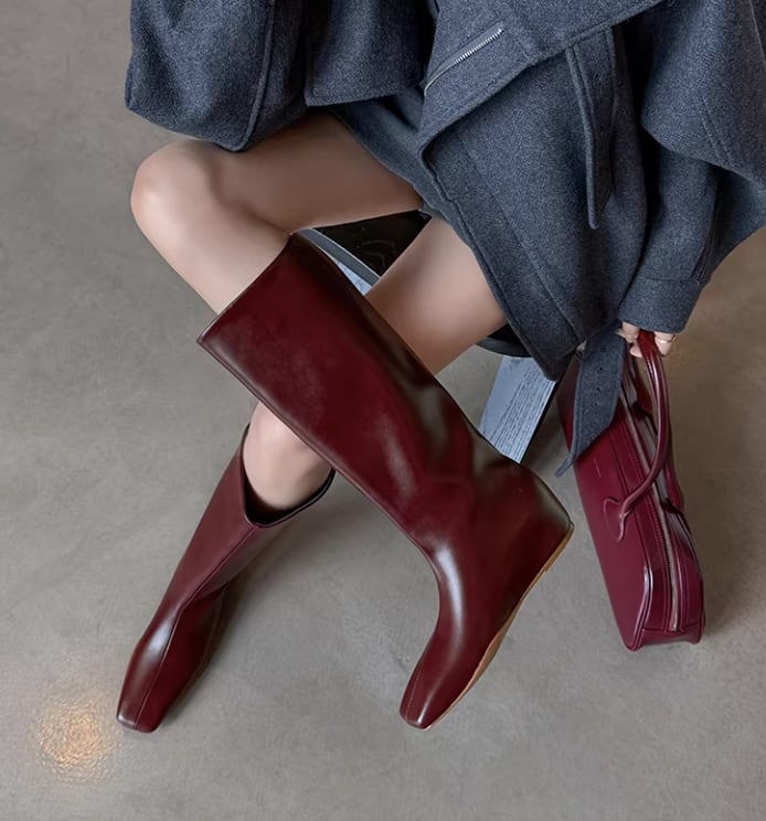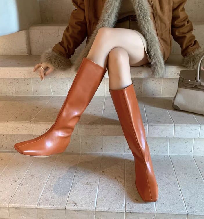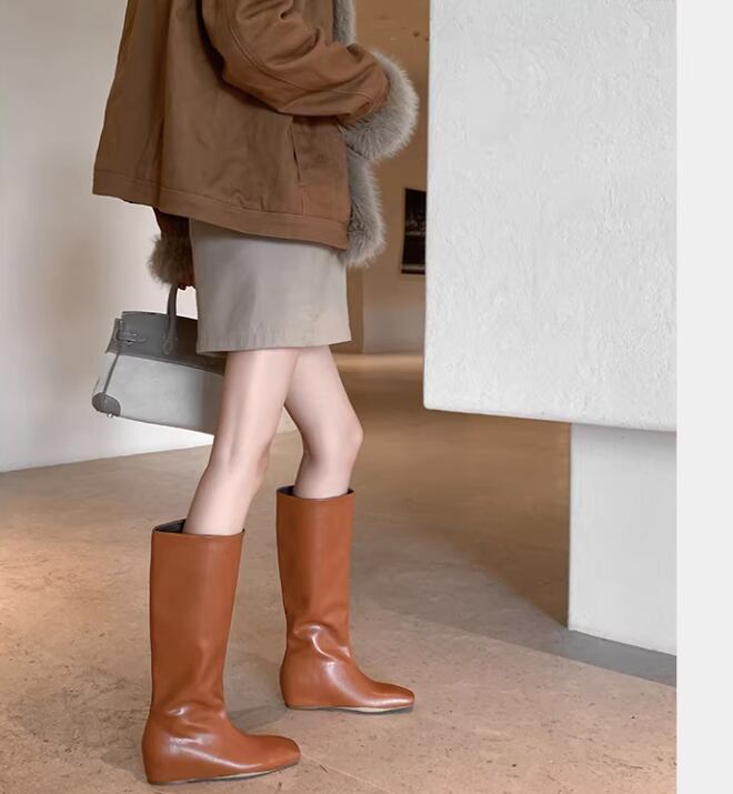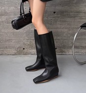 筒型のシルエットが足元をすっきりと見せてくれるミディ丈ロングブーツ。
