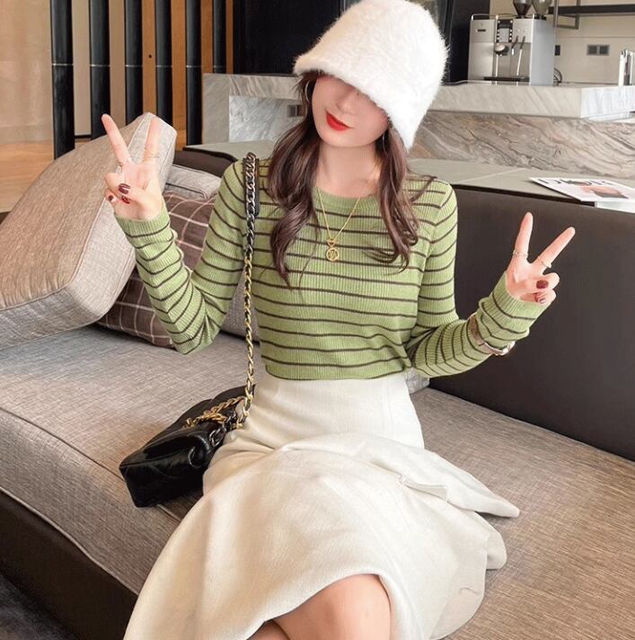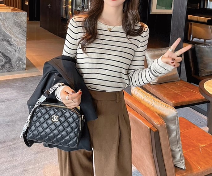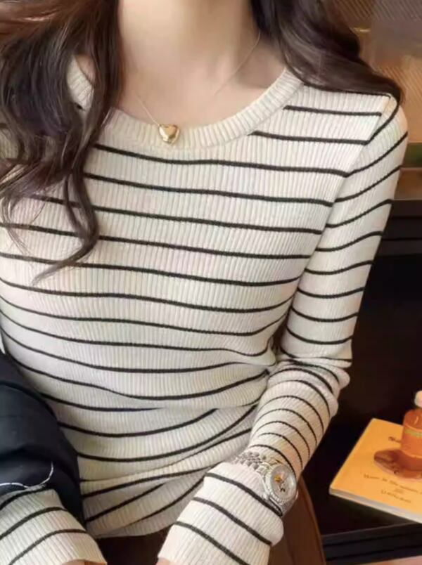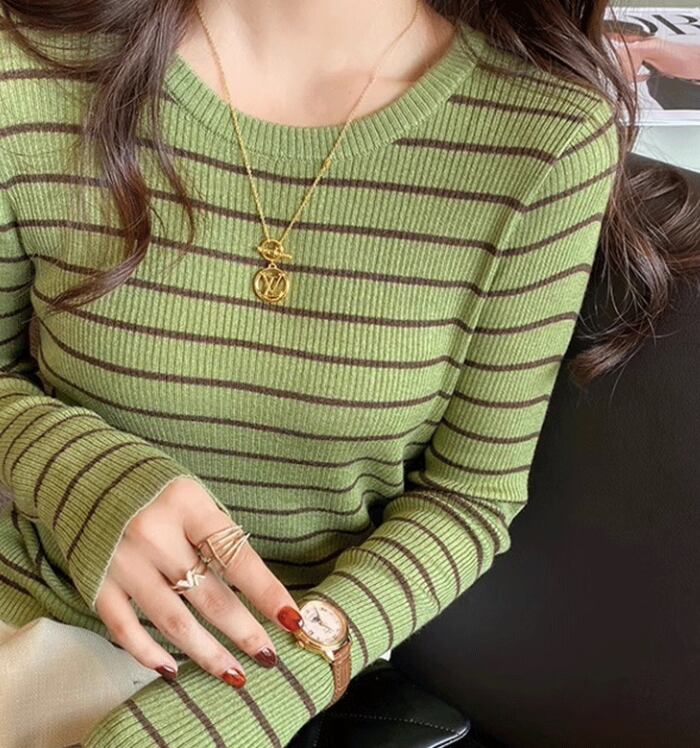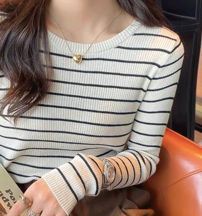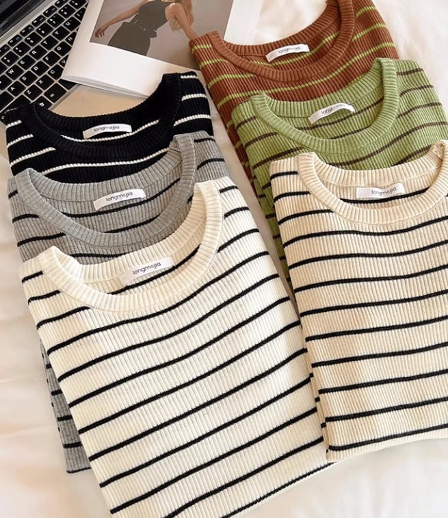 カジュアルながらも上品な印象を与える、ボーダー柄のリブ編みトップス。