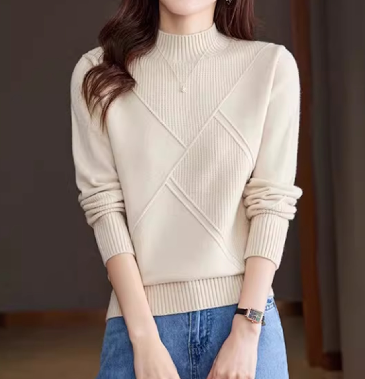 リブ編みが施された長袖デザインニット。