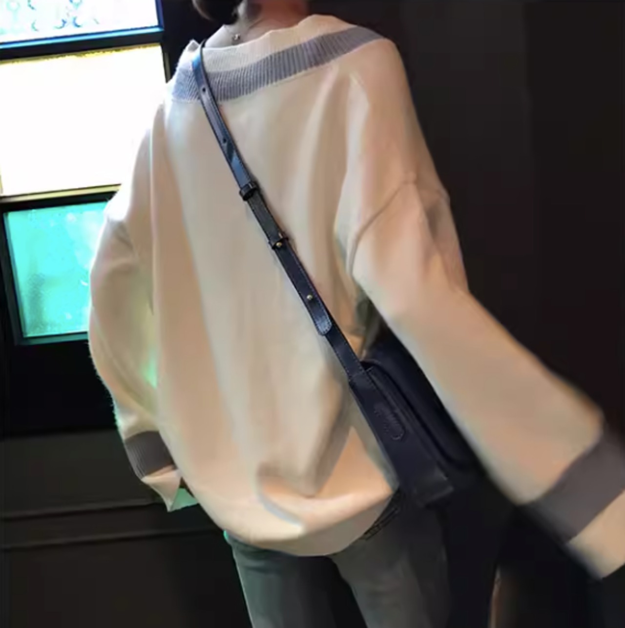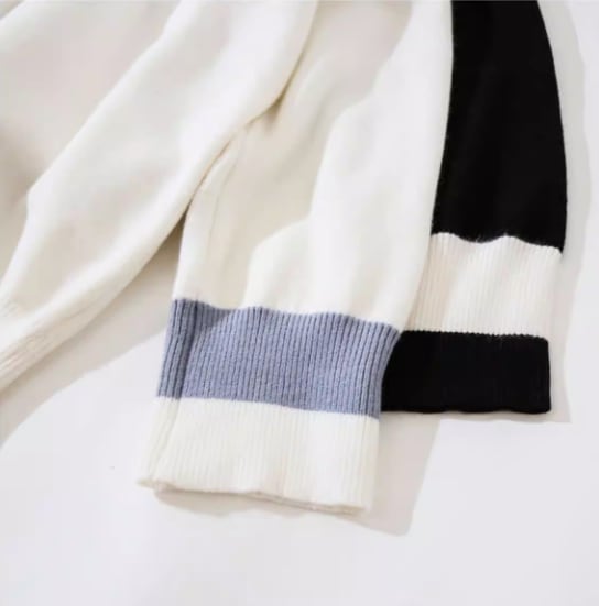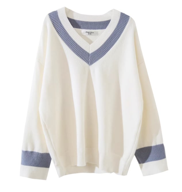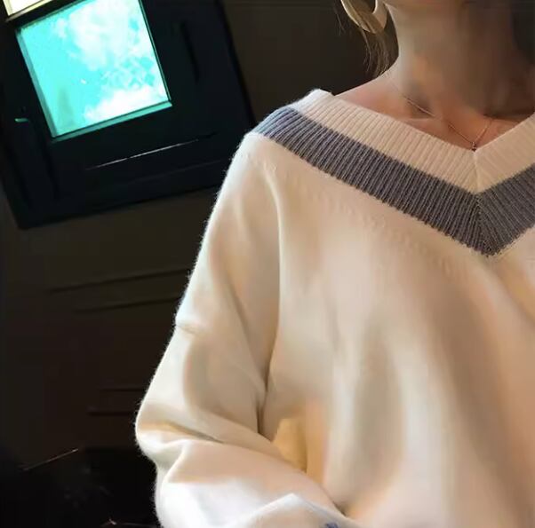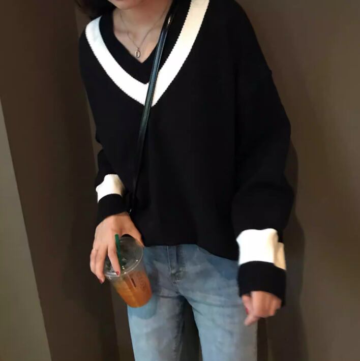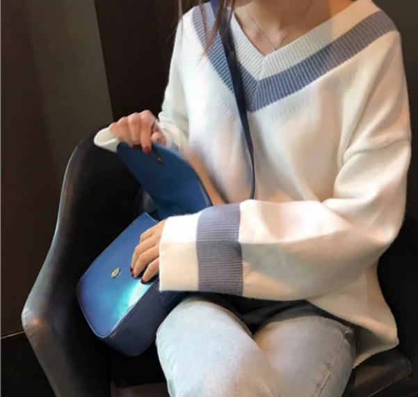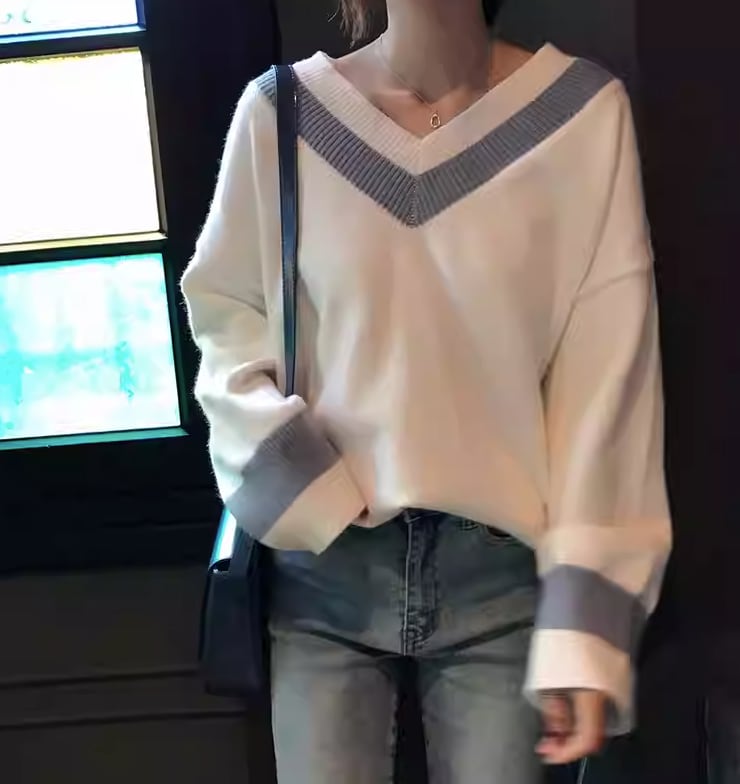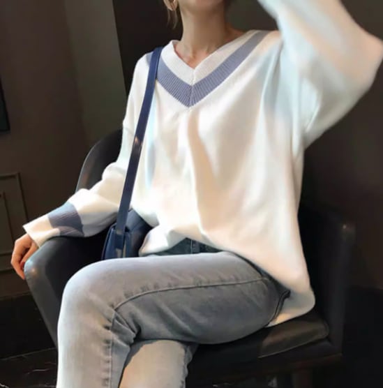 Vネックデザインが特徴の長袖ニットは、着回し力抜群のアイテム。オーバーサイズなので、気になる体型もカバーしてくれます。袖口とネックラインの配色ラインがアクセントとなり、シンプルな着こなしもスタイリッシュに決まります。