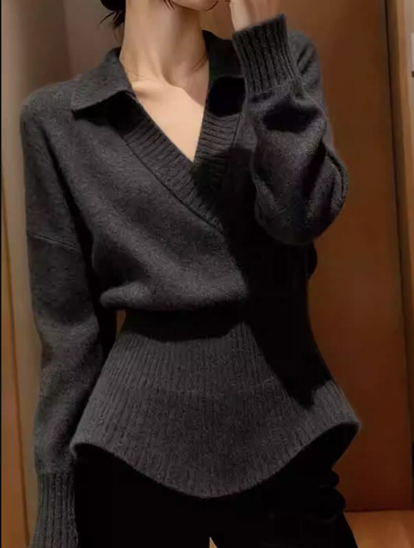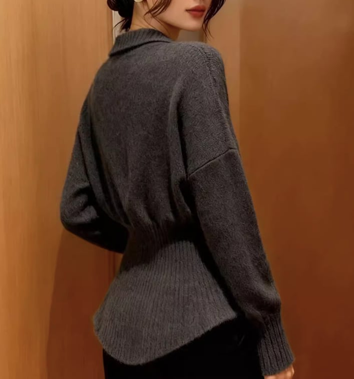 オープンカラー 長袖 ニット 腰丈 ニットポロシャツ / 097