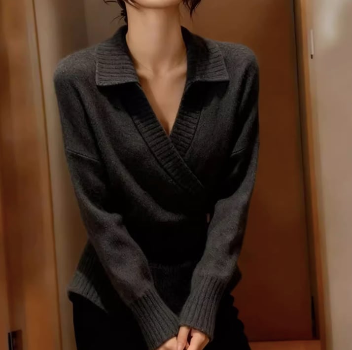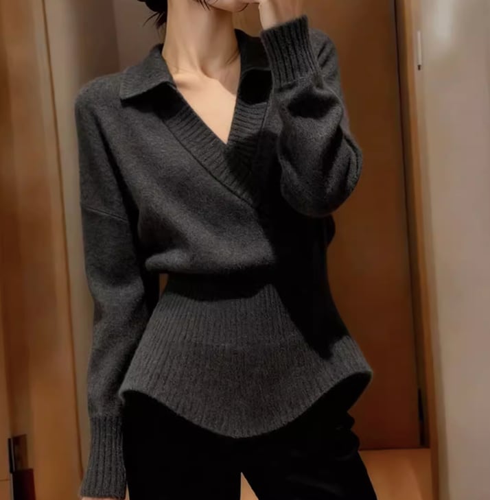 オープンカラーのデザインが、デコルテを美しく見せてくれる長袖ニット。カジュアルながらも上品な印象を与え、オフィスから週末のお出かけまで、幅広いシーンで活躍します。腰丈なので、スタイルアップ効果も期待できます。