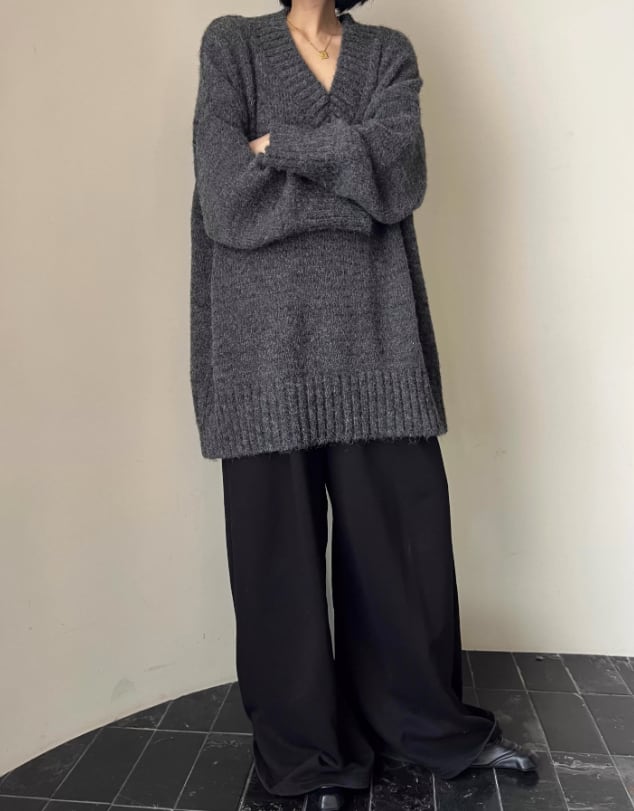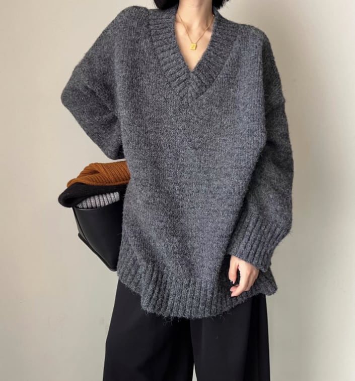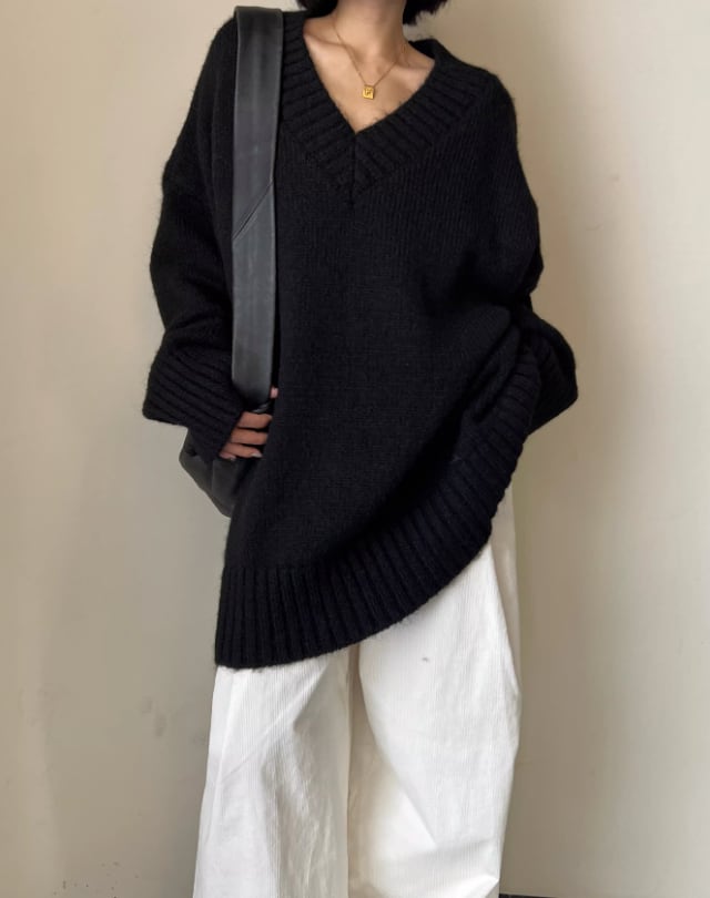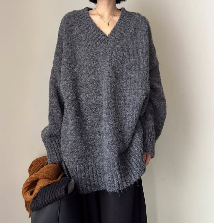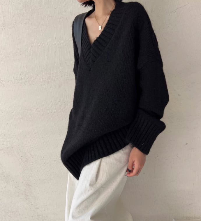 深めのVネックが、デコルテを美しく引き立てるニット。ゆったりとしたオーバーサイズシルエットで、リラックス感漂う着こなしが叶います。長めの袖は自然とくしゅっとたまるので着るだけでこなれた印象に。カジュアルなデニムから、きれいめなスカートまで、幅広いスタイリングに合わせやすい一枚です。