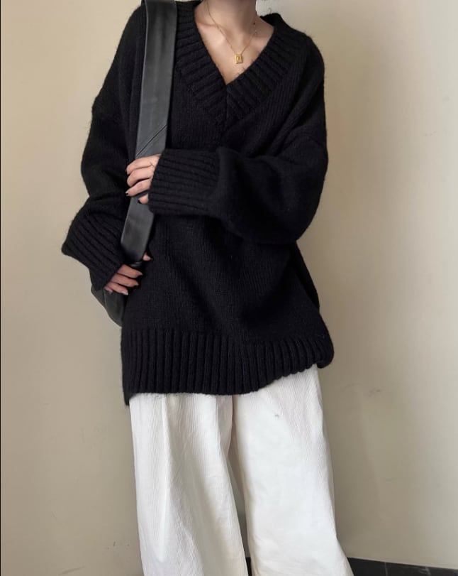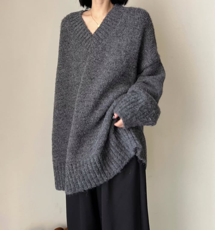 Vネック 長袖 ルーズ ニットトップス / 098