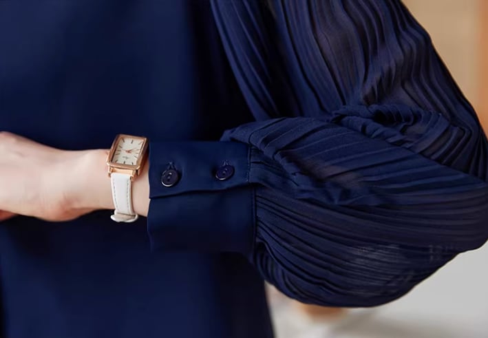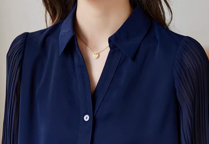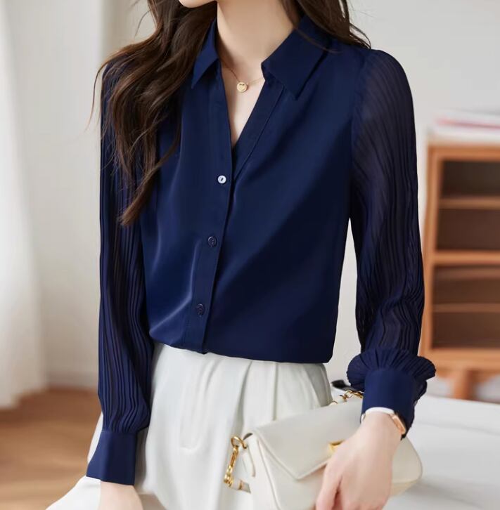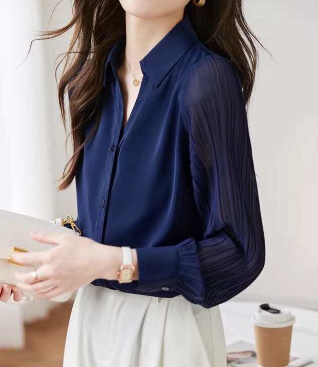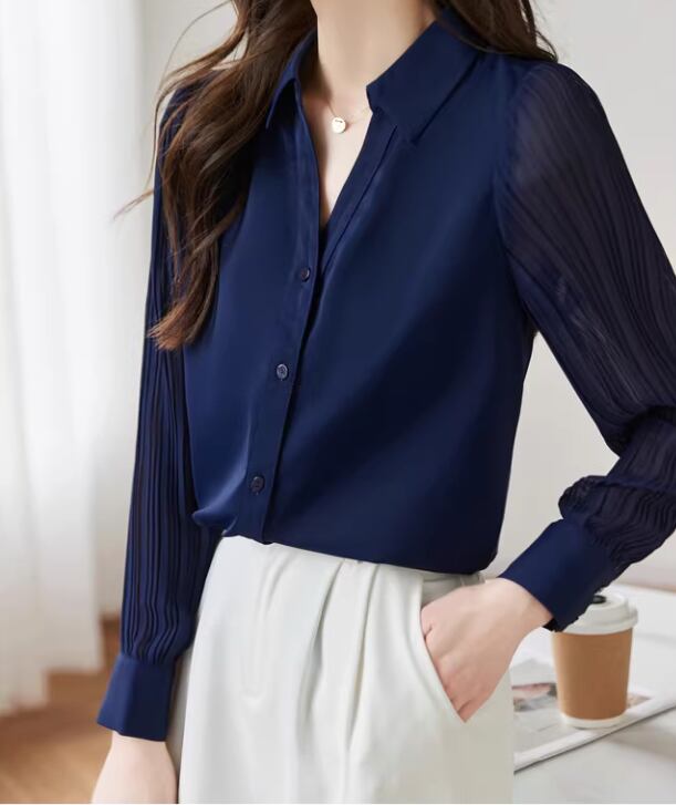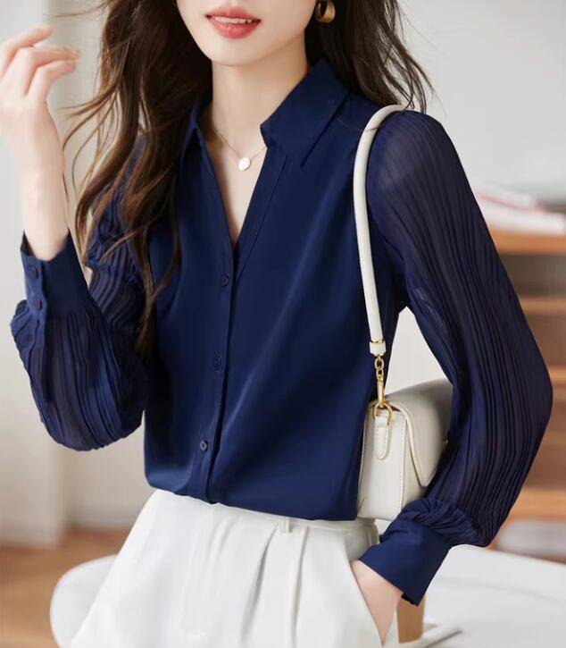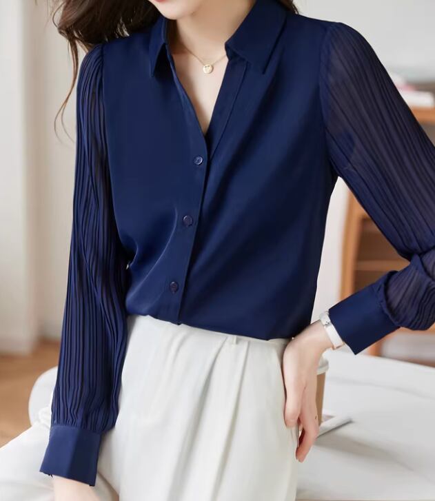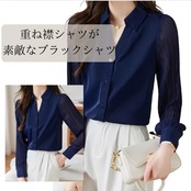 異素材の組み合わせが目を引く、シャツカラーブラウス。身頃は上品な印象、袖のシアーな切り替えが軽やかさをプラスします。オフィススタイルにはもちろん、カジュアルな着こなしにも合わせやすい一枚です。