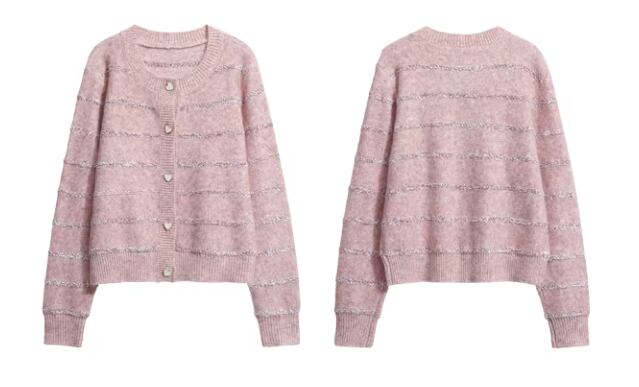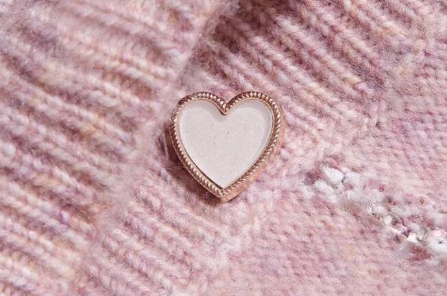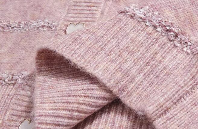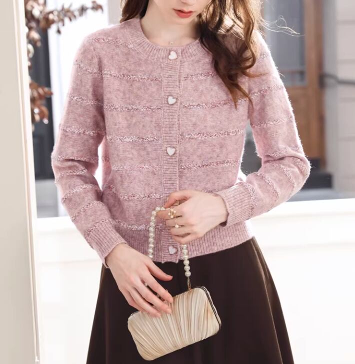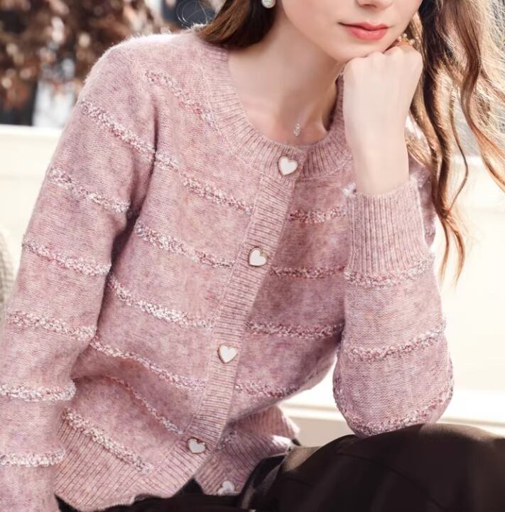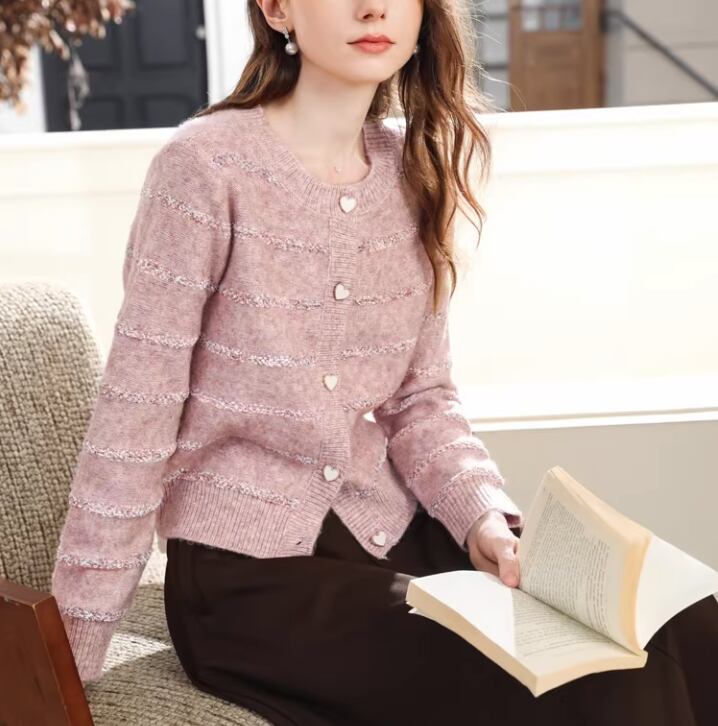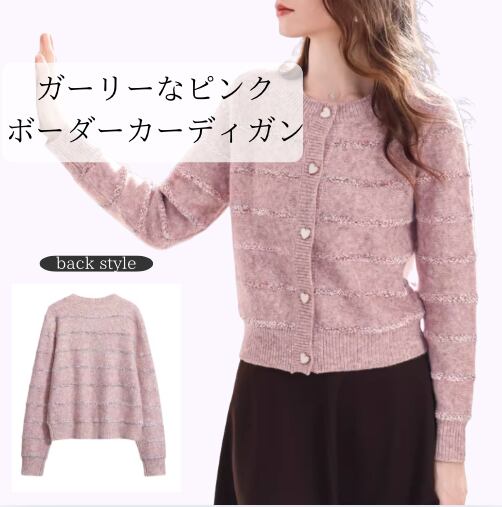 ハート形のボタンがさりげない可愛らしさをプラスするニットカーディガン。
