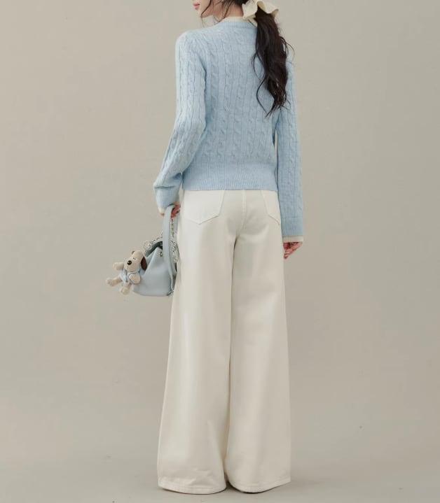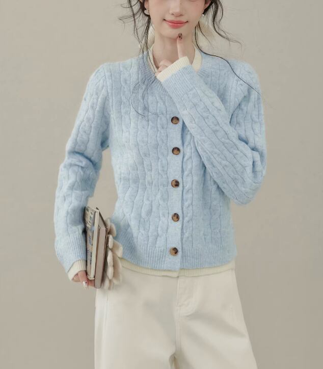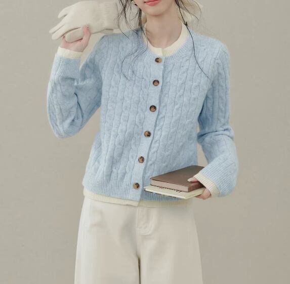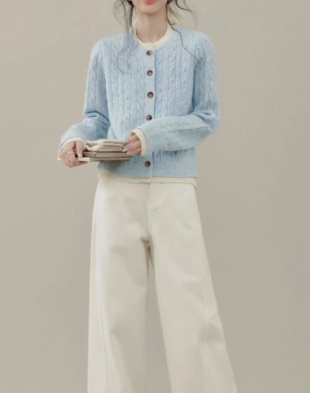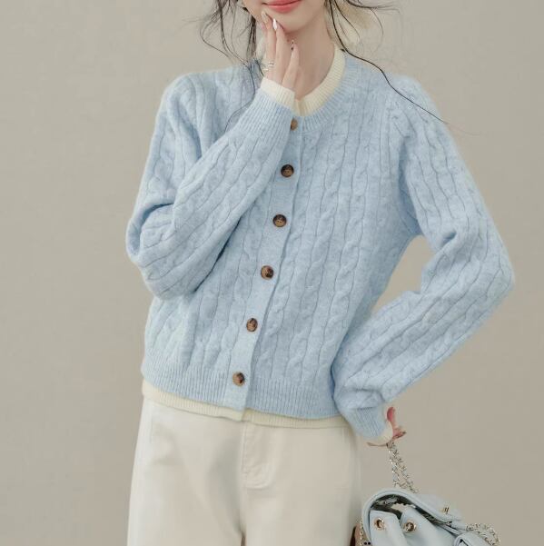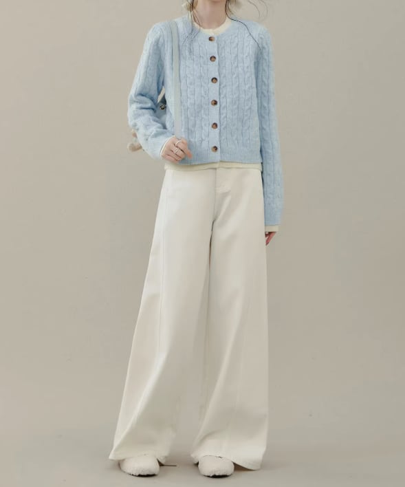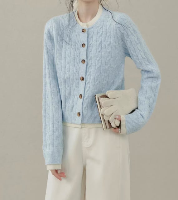 ケーブル編みが目を引く、ボタンフロントのミドル丈ニットカーディガン。