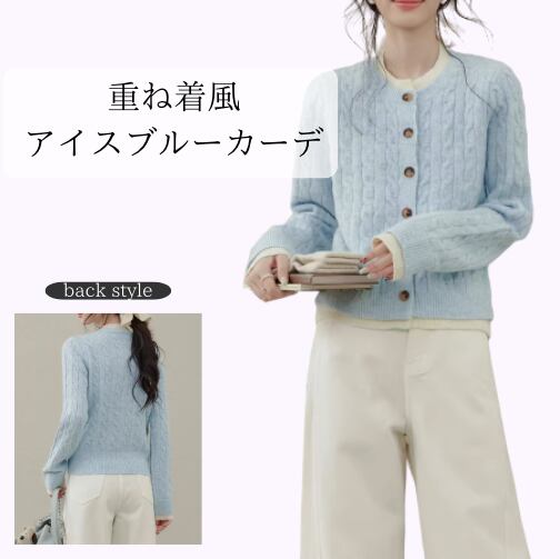 重ね着風 ケーブル編み ボタンフロント ミドル丈 ニットカーディガン / 140