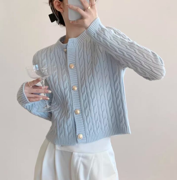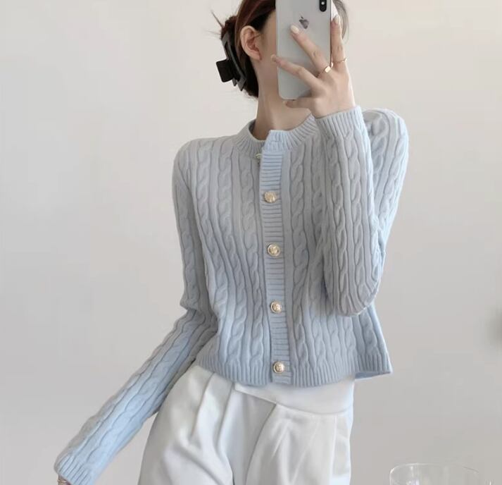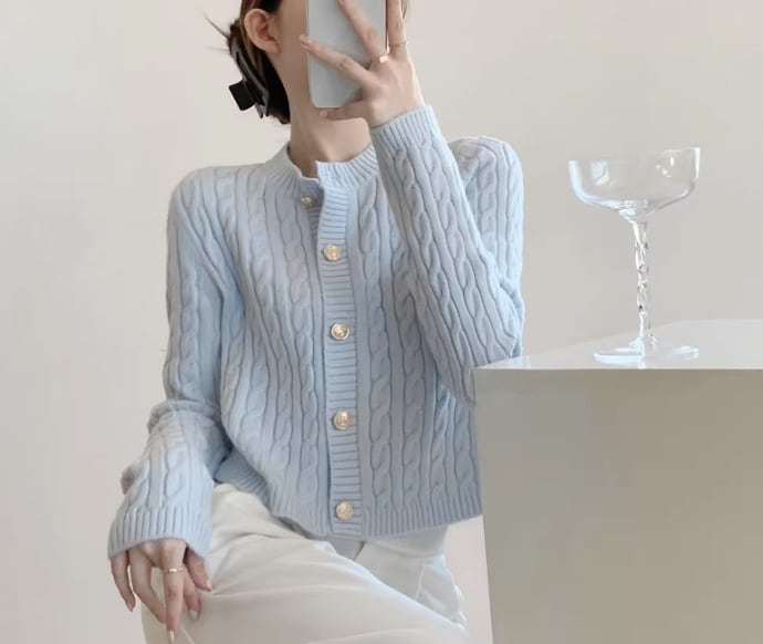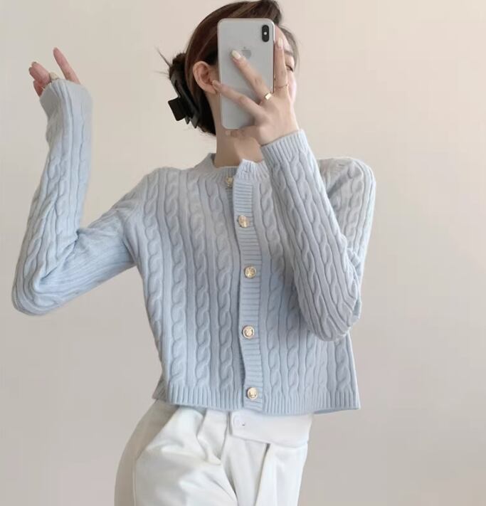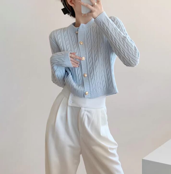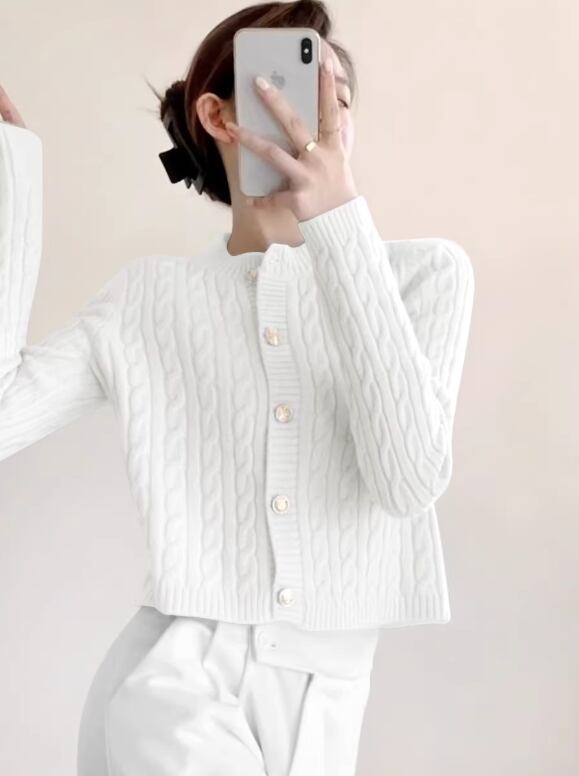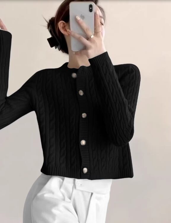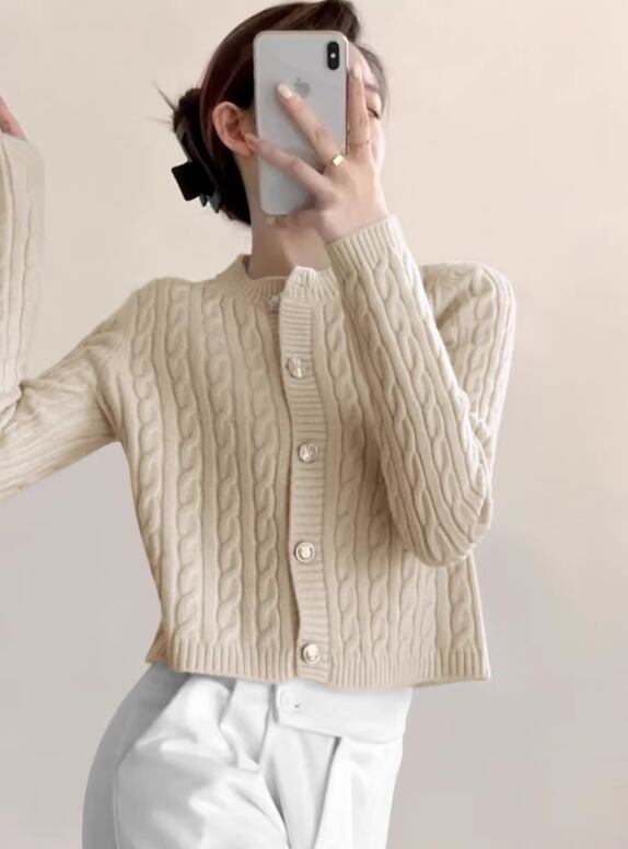 ケーブル編みが上品な印象を与えるニットカーディガン。クロップド丈なので、ハイウエストのボトムスと合わせるとスタイルアップ効果も期待できます。普段使いはもちろん、オフィスやデートなど、様々なシーンで活躍する一枚です。