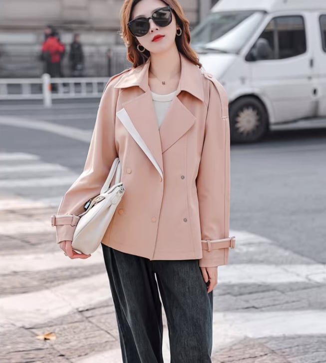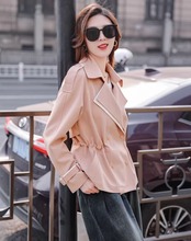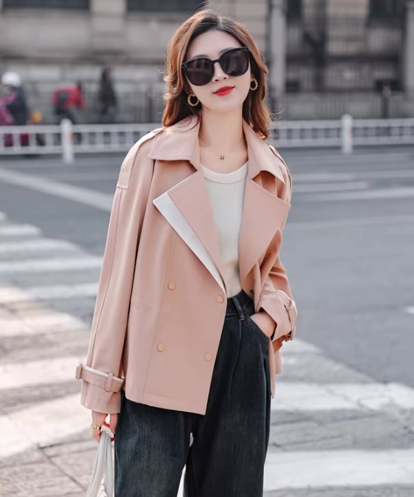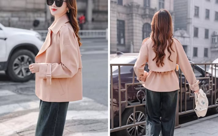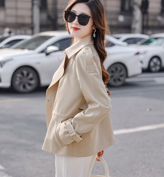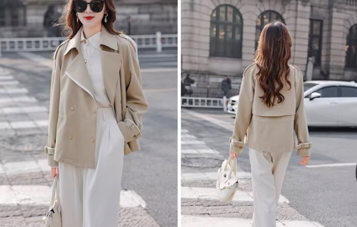 襟のカラーが目を引く、ハーフ丈トレンチ。