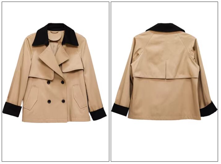 スタンドカラー風のデザインが印象的な、ダブルブレストのヒップ丈ジャケット。