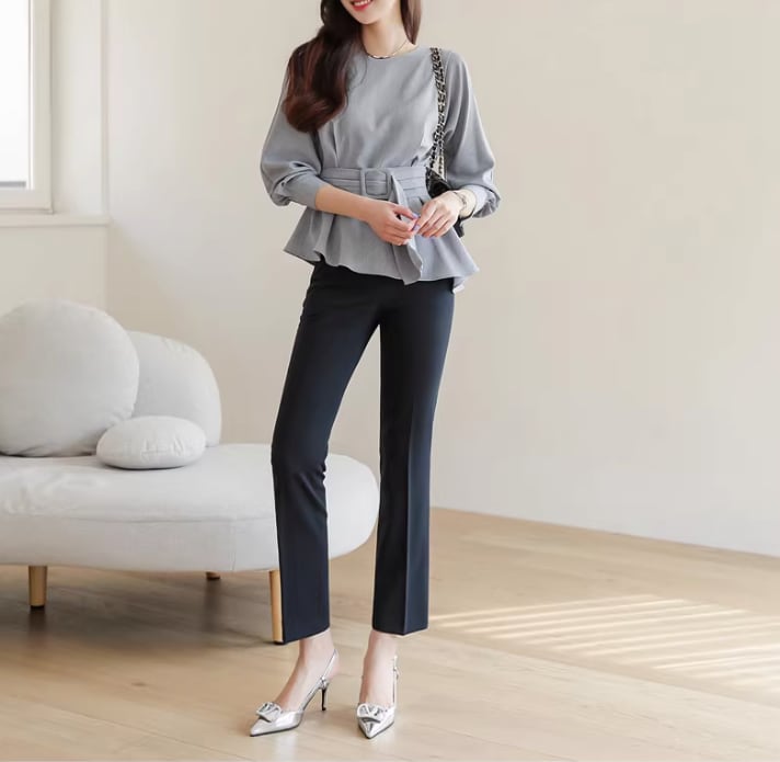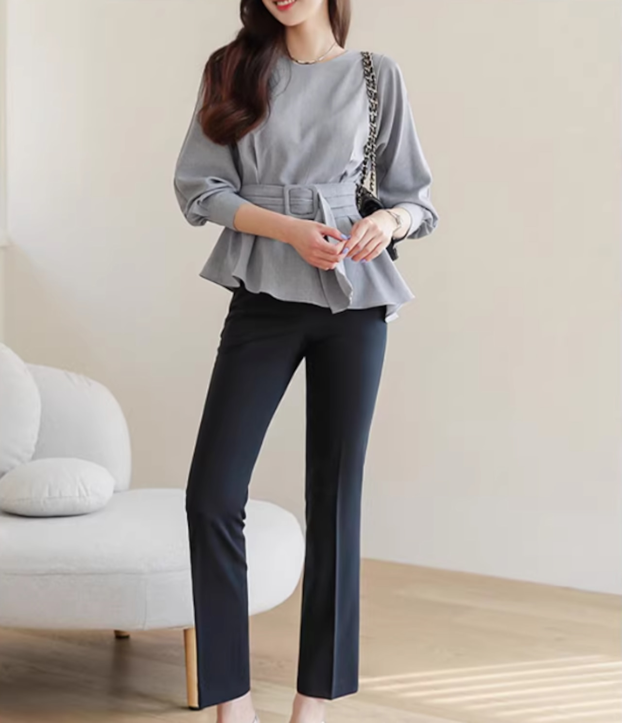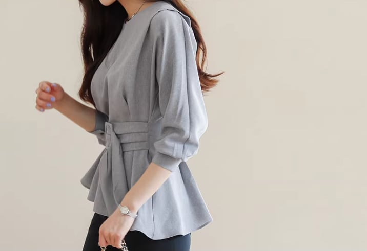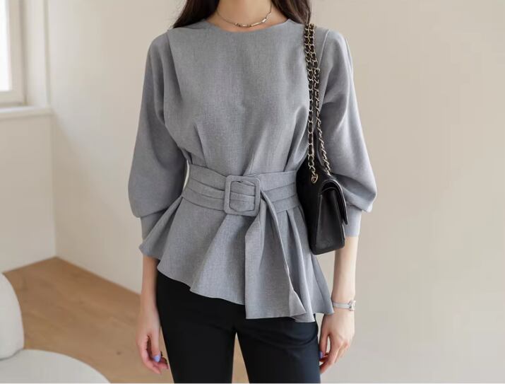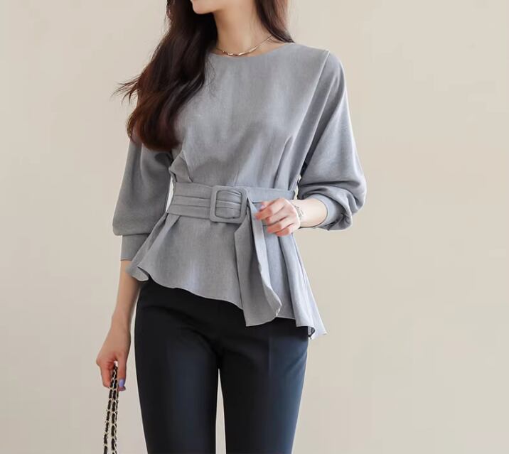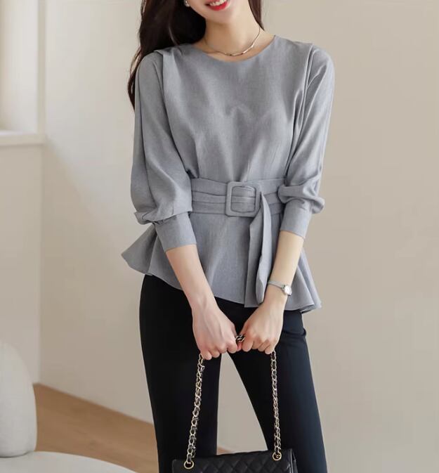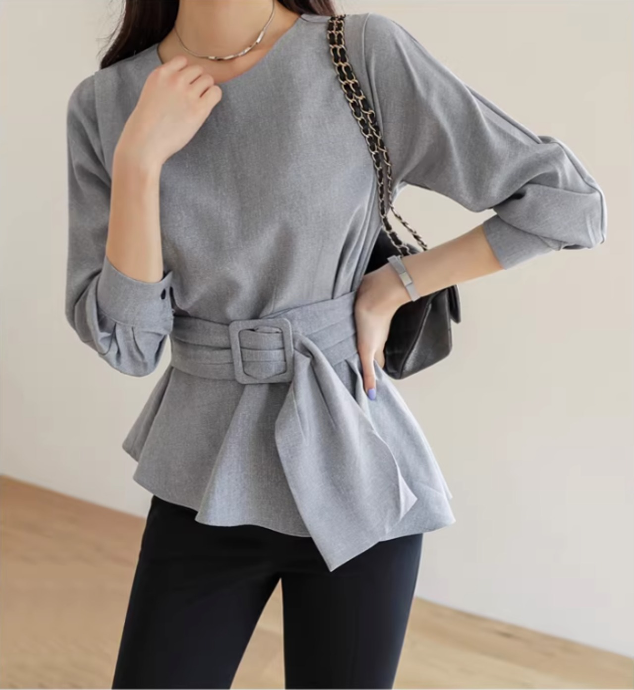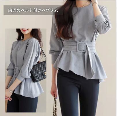 ベルト付き チュニック丈 長袖 ペプラムブラウス / 166